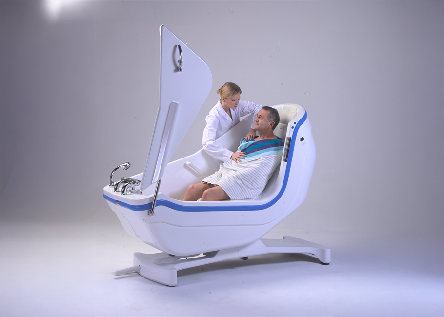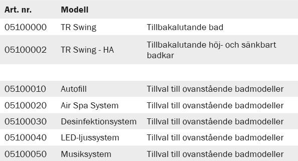 Modellen är bakåtlutande samt höj- och sänkbar för ökad säkerhet och komfort. Badkaret är öppningsbart med dörr och har en smidig åtkomst från sidan. TR Swing kan utrustas med flera olika tillbehör.