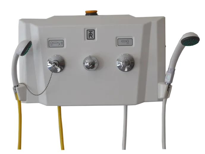 TR 2810 är en väggmonterad Dusch- och desinfektionspanel med termostatblandare och separat rengöringssystem som tillsammans med TR Duschvagn blir ett komplett duschsystem.